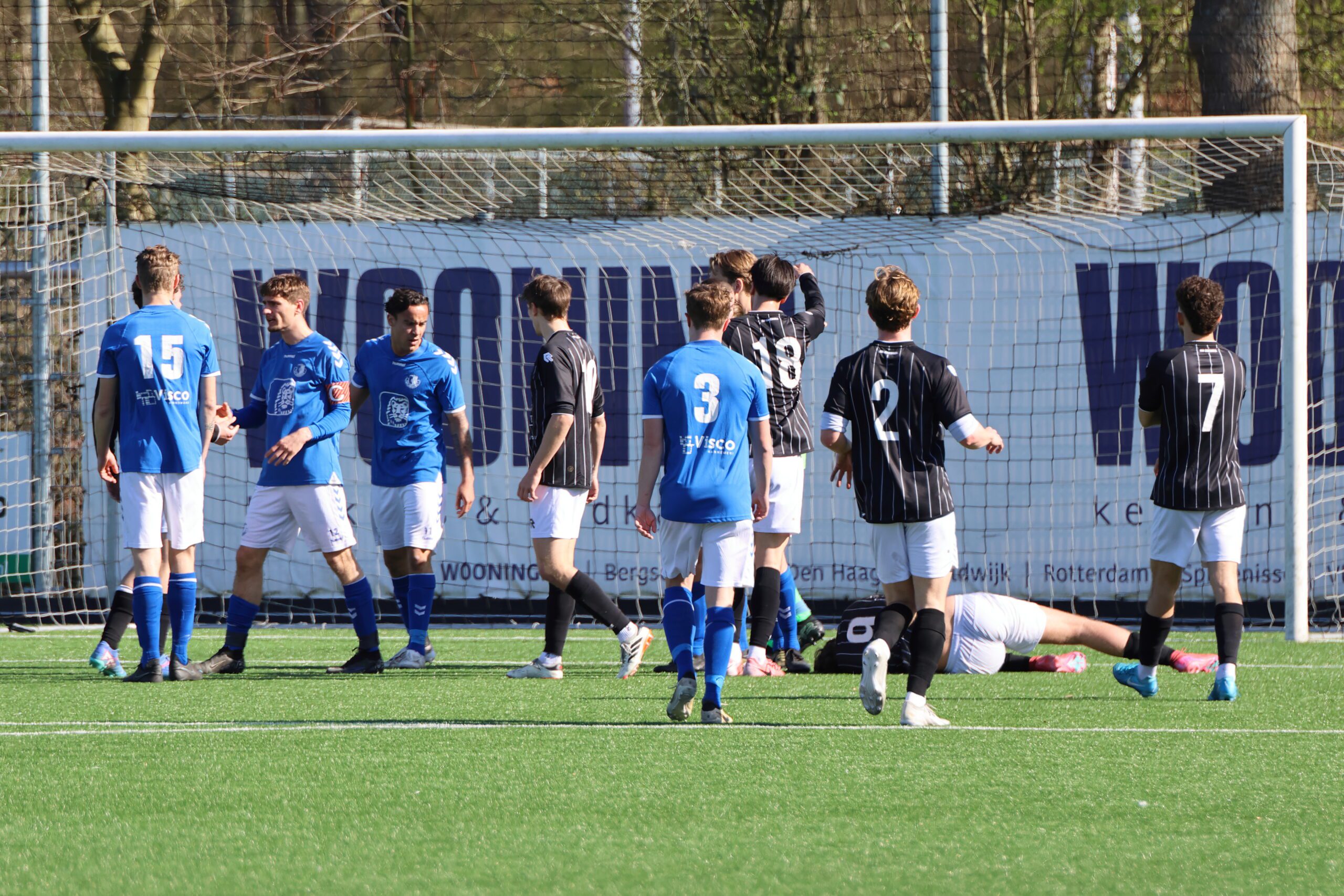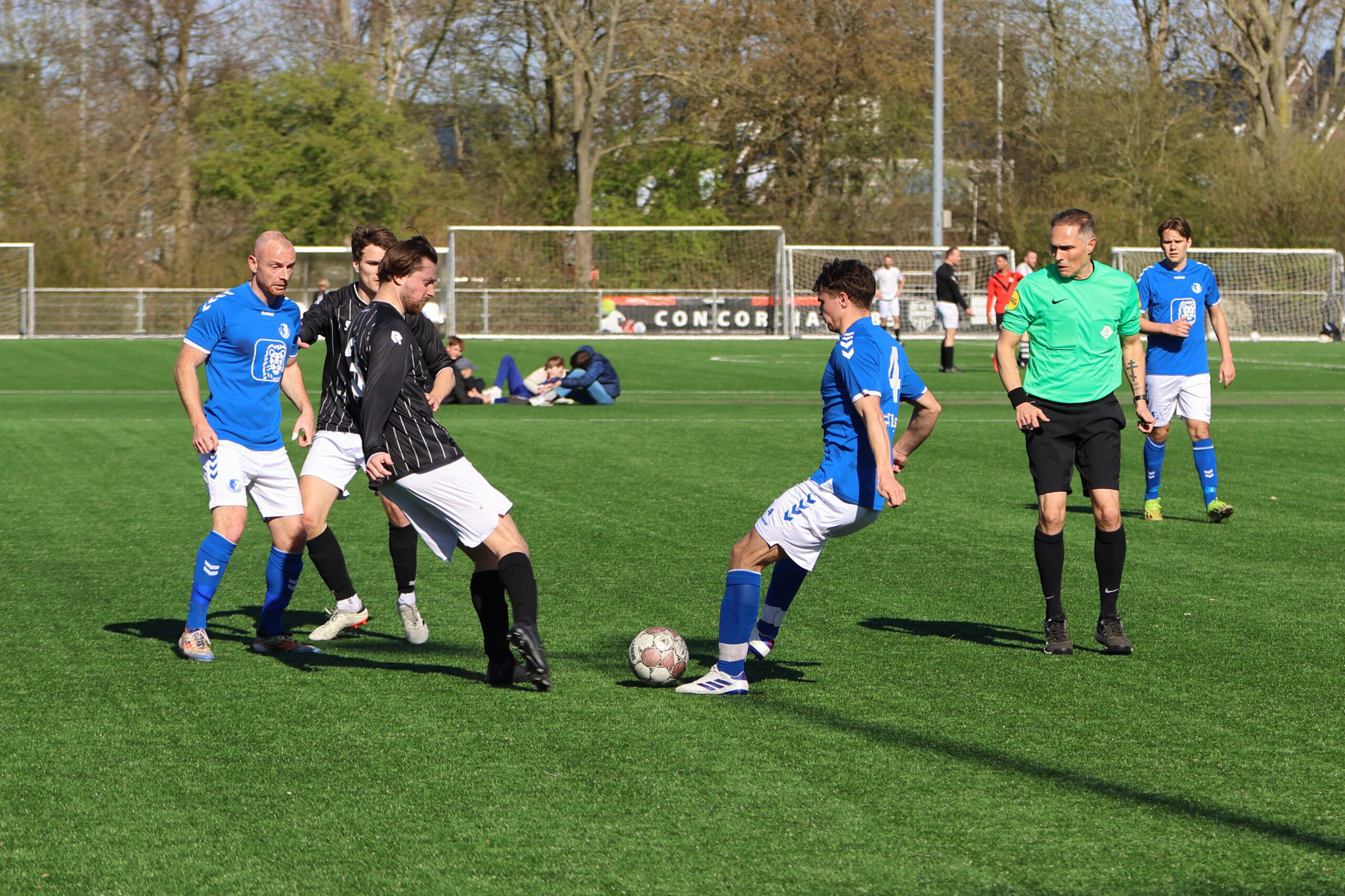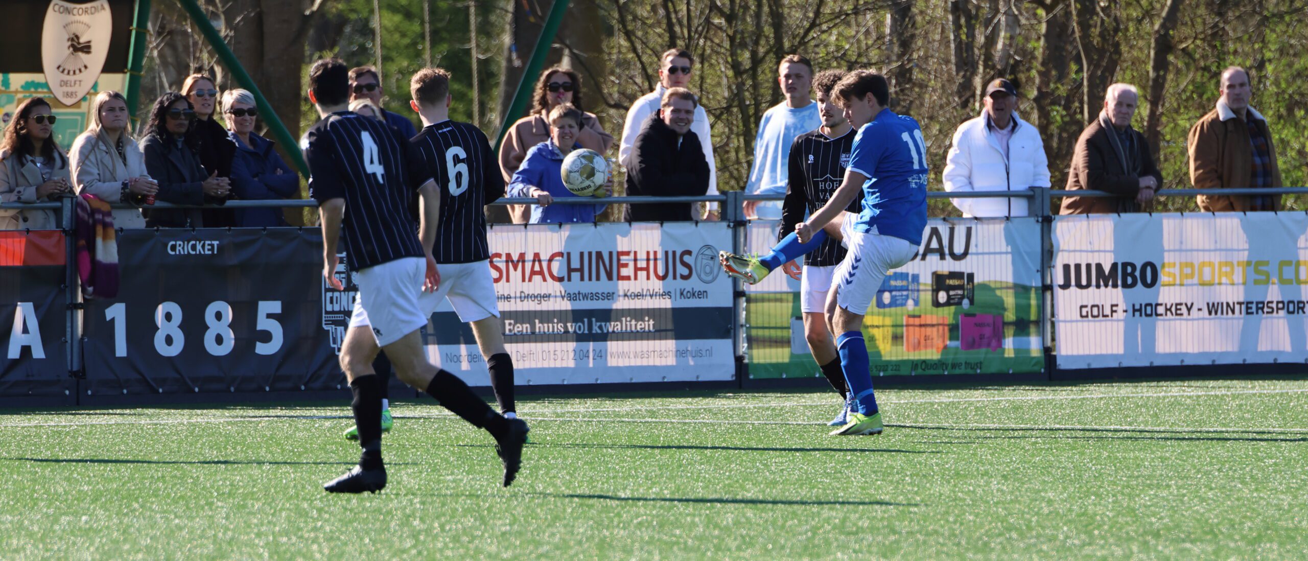In de eerste tien minuten was Concordia beter en dwong als enige kansen af. Toen een Delftenaar één-op-één richting Wessel Rienstra ging, kon hij met een schuiver in de onderhoek langs Rienstra scoren en zo werd het al snel 1-0. Kort daarna kreeg Loosduinen een penalty mee na een handsbal van een Concordia-speler. De man achter de bal was Peter de Kleer en hij hield zijn hoofd koel door de stand vier minuten na de eerste goal op 1-1 te brengen. De score bleef zich in rap tempo ontwikkelen, want twee minuten na de Loosduinse goal kwam Concordia opnieuw op voorsprong en moest Loosduinen weer van voren af aan beginnen. De neutrale kijker had niets te klagen: drie goals in vijftien minuten zorgden voor een vermakelijke wedstrijd. Een oliedom moment in de Loosduinse achterhoede volgde, toen Wessel Rienstra de bal in zijn handen pakte na een terugspeelbal. De straf daarvoor was een indirecte vrije trap in het zestienmetergebied. Loosduinen was echter scherp en blokte de vrije trap. Het doelpuntenfestijn ging verder: Bart Ruwaard kreeg de bal na een geweldige voorzet van Tico Eckhardt op zijn hoofd en kopte goed binnen, waardoor het 2-2 werd. Meteen daarna kreeg Concordia een penalty mee, waarmee de vijfde goal in 25 minuten kon vallen. Dat gebeurde ook, en de Delftenaren kwamen opnieuw op voorsprong. Rustmomenten waren schaars, want niet veel later werd opnieuw een penalty gegeven. De bal werd met de hand van de lijn gehaald, wat resulteerde in een strafschop en een rode kaart. Damian van der Horst ging achter de bal staan en rondde koelbloedig af, waardoor de stand na dertig minuten al 3-3 was. Loosduinen speelde vanaf dat moment met een man meer, maar toch kwam Concordia voor rust nog op voorsprong. Na een dieptebal werd de verdediging geklopt en wist Concordia opnieuw te scoren. De chaos hield niet op. Dean van Velzen kreeg na een sliding op de bal zijn tweede gele kaart en moest met rood het veld verlaten. Zo stond ook Loosduinen met tien man. Toen was het eindelijk rust en konden de toeschouwers op de tribune even op adem komen.
