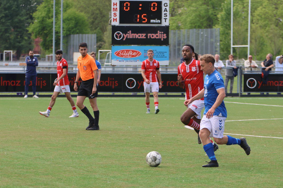 Na vijftien minuten kreeg Loosduinen de eerste kans van de wedstrijd: een kopbal van Bart Ruwaard ging net naast, waardoor de stand gelijk bleef. Het spel kende weinig kansen en het tempo lag laag. Het was duidelijk dat Loosduinen nergens meer voor speelde. Toch kwam de ploeg op voorsprong. Na een goede combinatie en een knap schot bracht Peter de Kleer Loosduinen op een 0-1 voorsprong. Kort daarna kreeg Loosduinen opnieuw een grote kans na een mooie actie van Bart Ruwaard vanaf de linkerkant, maar hij miste net, waardoor het niet lukte de voorsprong te verdubbelen. Aan de andere kant dook HMSH op voor keeper Wessel Rienstra. Na contact met Wessel ging een speler van HMSH liggen en de scheidsrechter kende een penalty toe. Deze werd benut, waardoor de stand na 41 minuten op 1-1 kwam. Vervolgens gingen beide ploegen de kleedkamers in voor de rust.