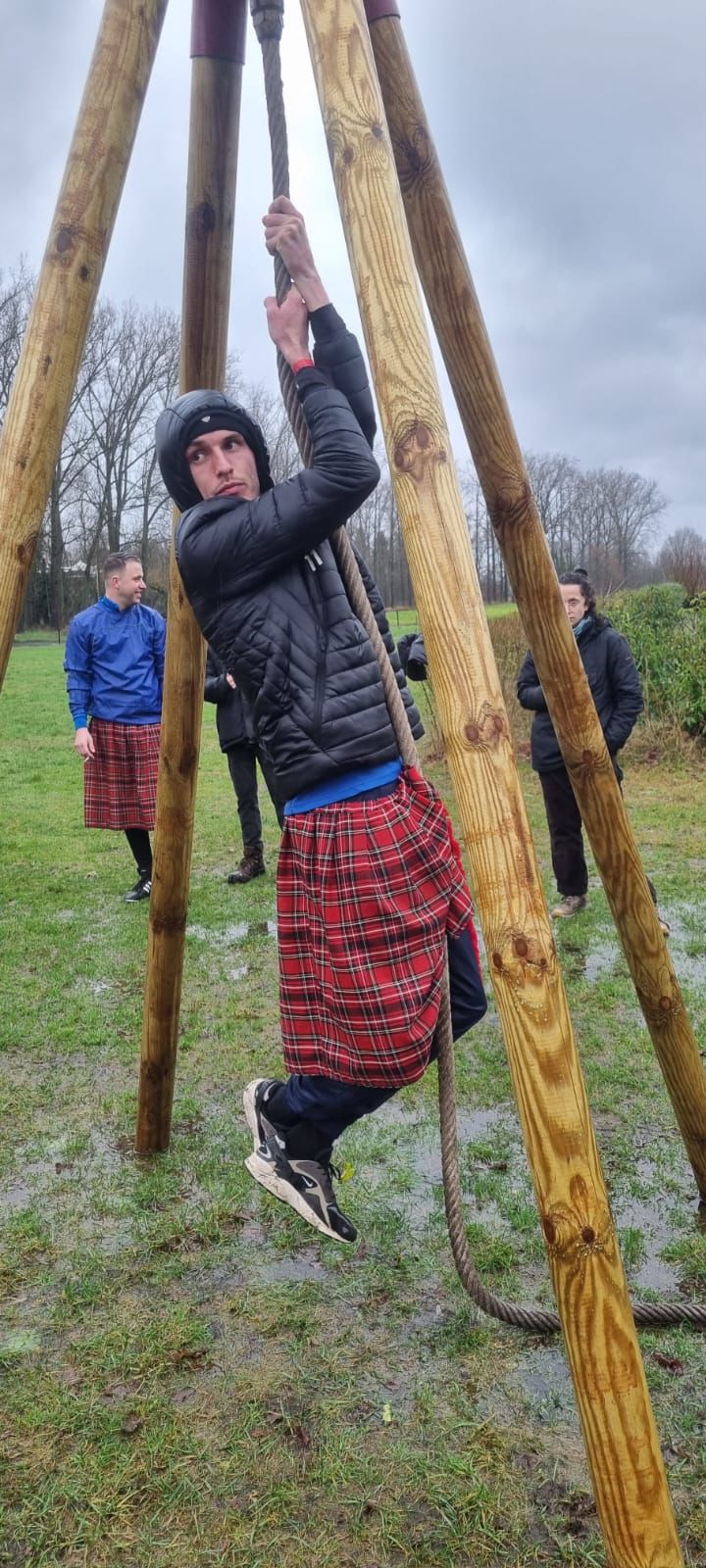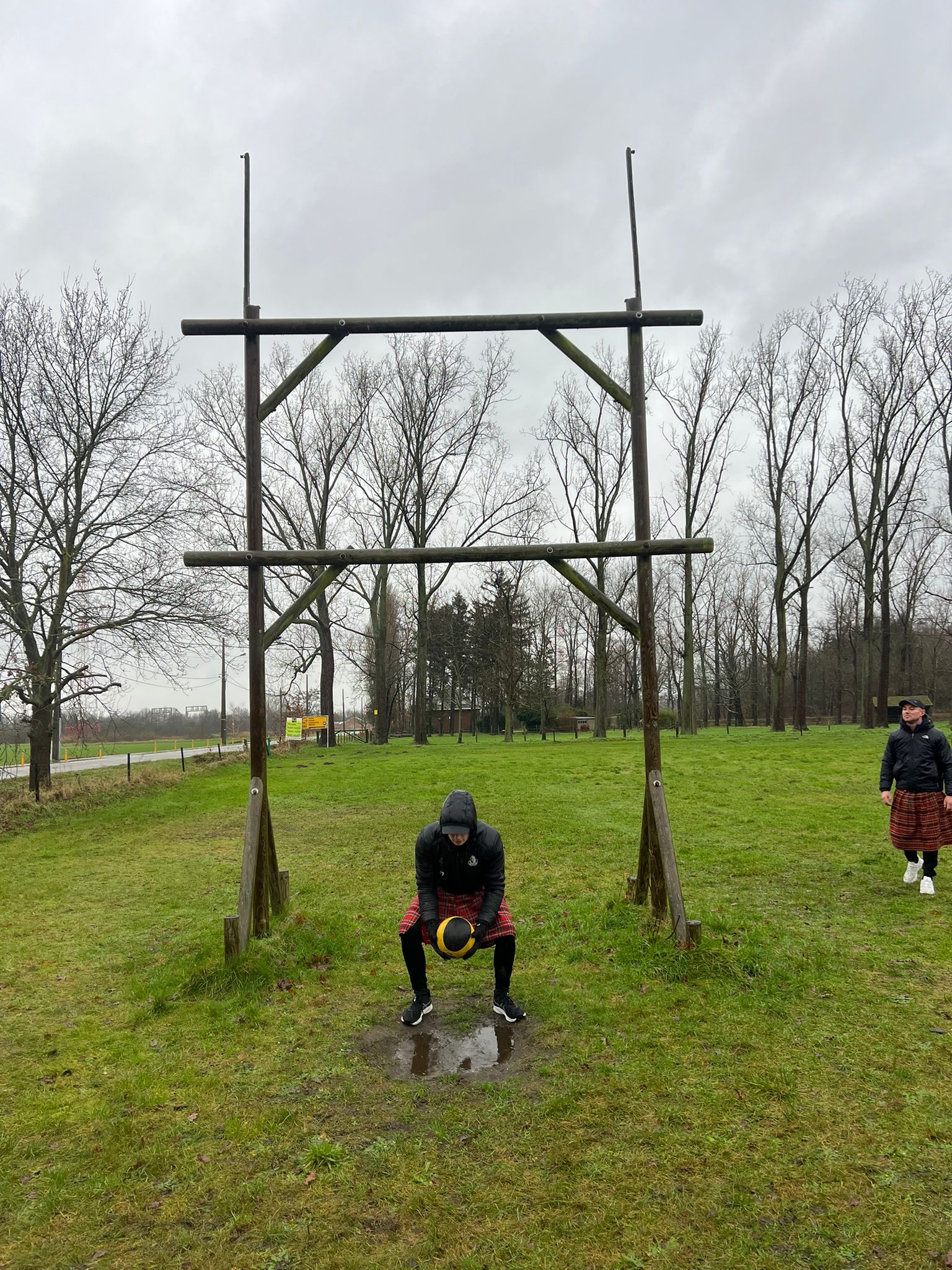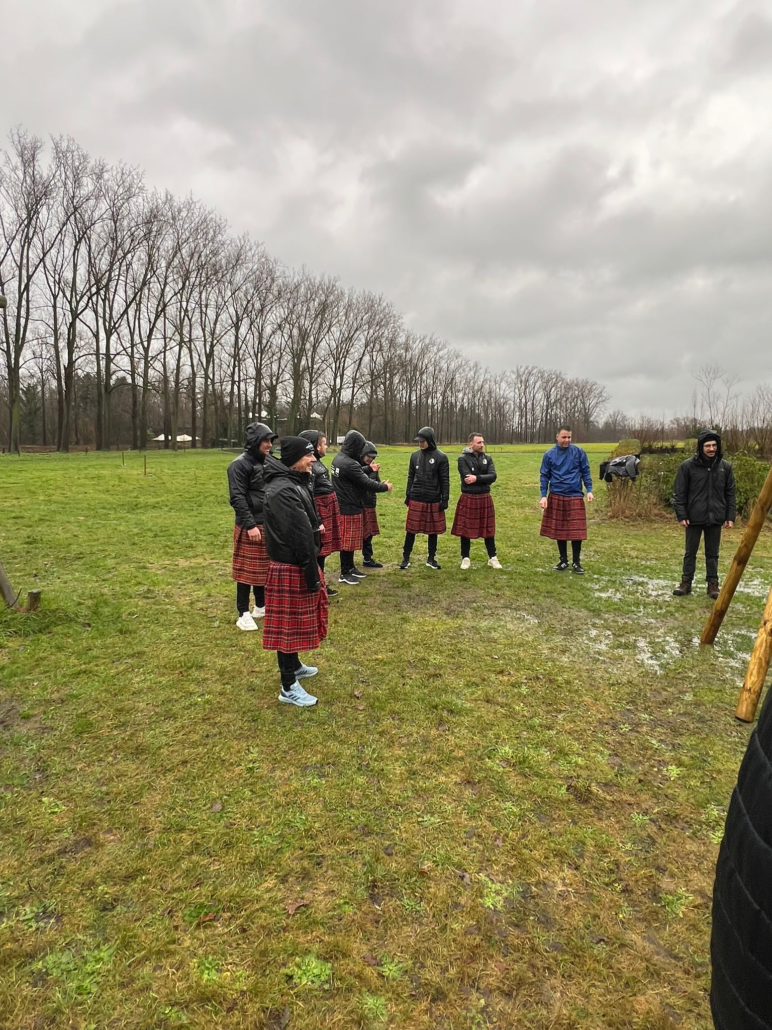 We horen jullie denken Highland games??? Dit zijn oud Schotse spelletjes die je kan winnen door het gebruik maken van je kracht, samenwerken of tactisch vermogen. Nou dat is voor ons na een zware nacht wel weggelegd. In de regen ontspon zich een ware strijd tussen de verdeelde teams. Eén team genaamd “Soepoog” met Alvin als leider. Laat deze leider nu dan ook net een ontstoken “soepoog” hebben. Andere spelers uit dit team waren Mike, Danny, Randy, Nick, Dylan en Titus.