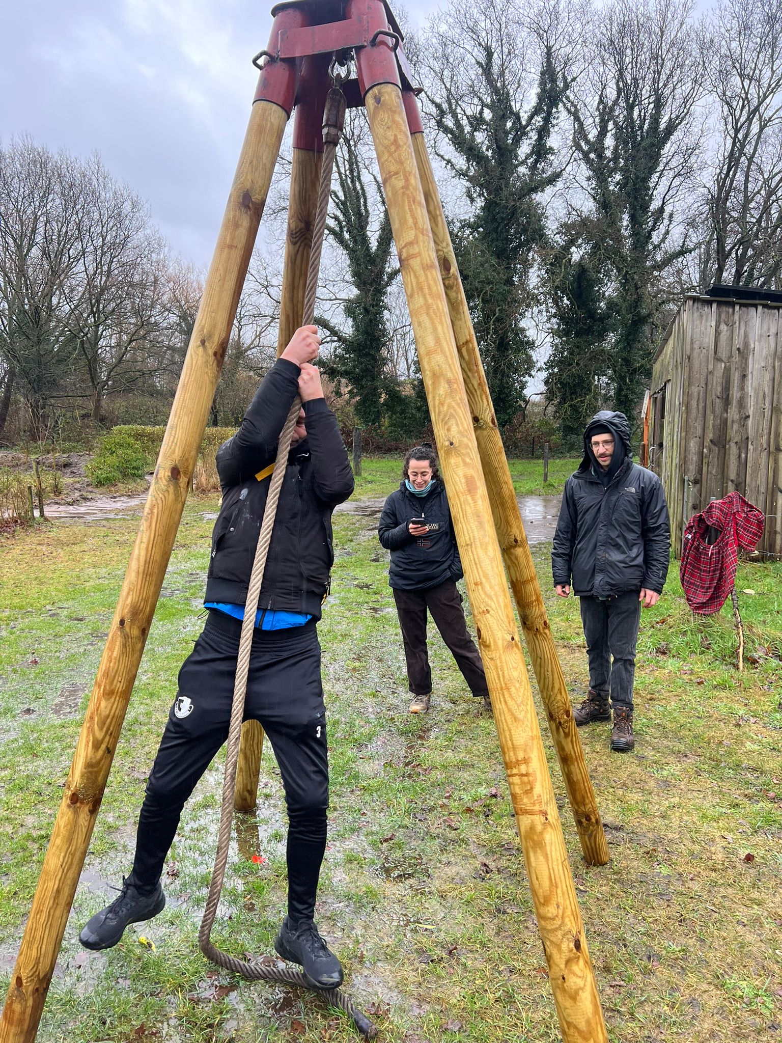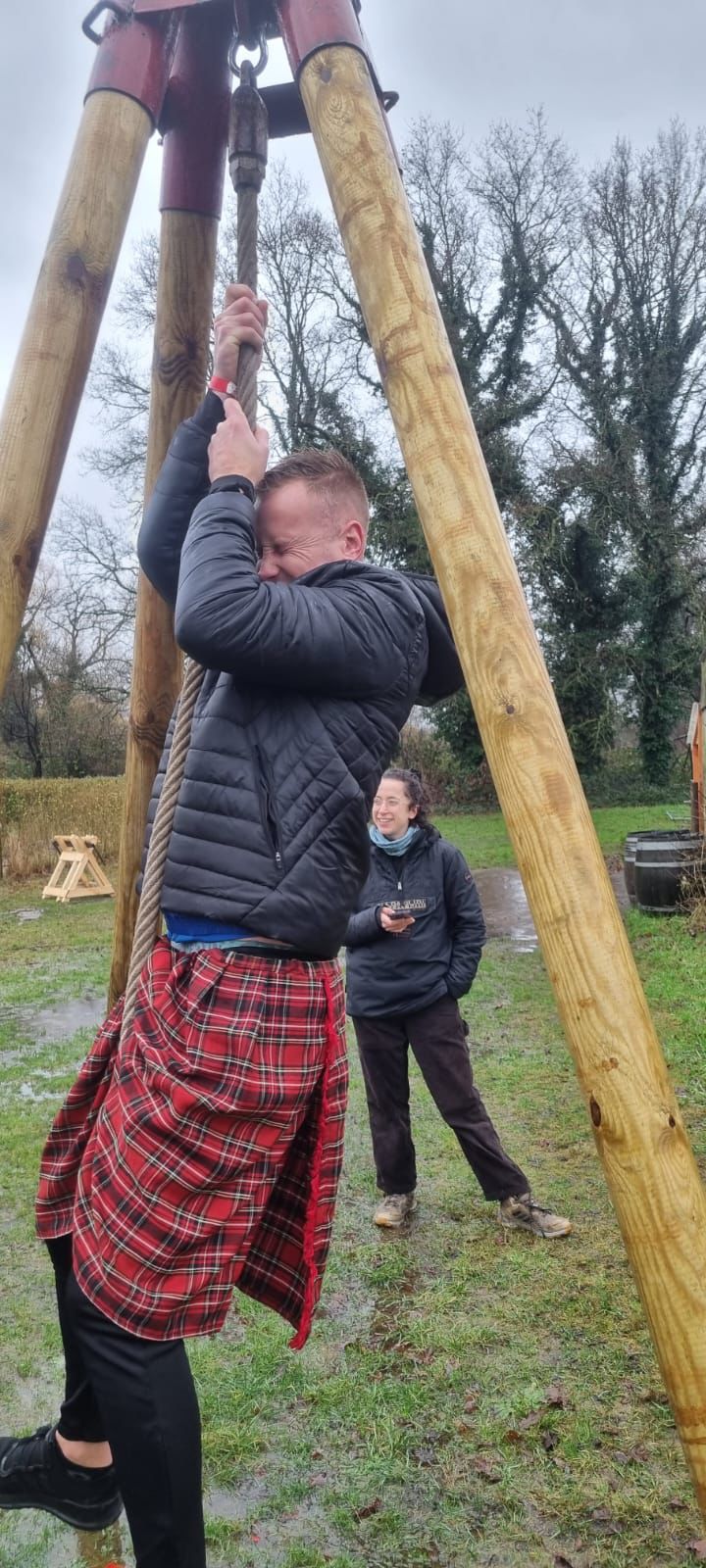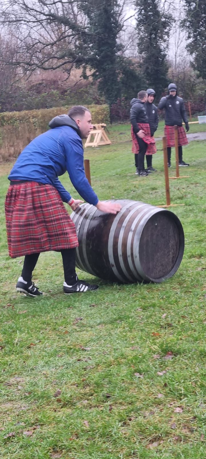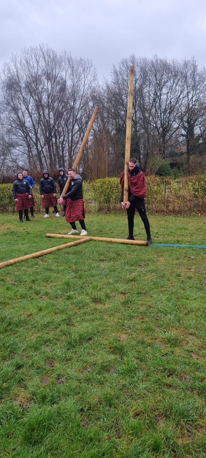 We horen jullie denken Highland games??? Dit zijn oud Schotse spelletjes die je kan winnen door het gebruik maken van je kracht, samenwerken of tactisch vermogen. Nou dat is voor ons na een zware nacht wel weggelegd. In de regen ontspon zich een ware strijd tussen de verdeelde teams. Eén team genaamd “Soepoog” met Alvin als leider. Laat deze leider nu dan ook net een ontstoken “soepoog” hebben. Andere spelers uit dit team waren Mike, Danny, Randy, Nick, Dylan en Titus.